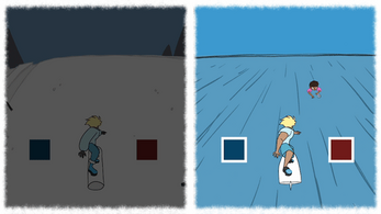 A rhythm game with a split down the middle. Control both a snowboarder and a surfer and knock people out of your way!